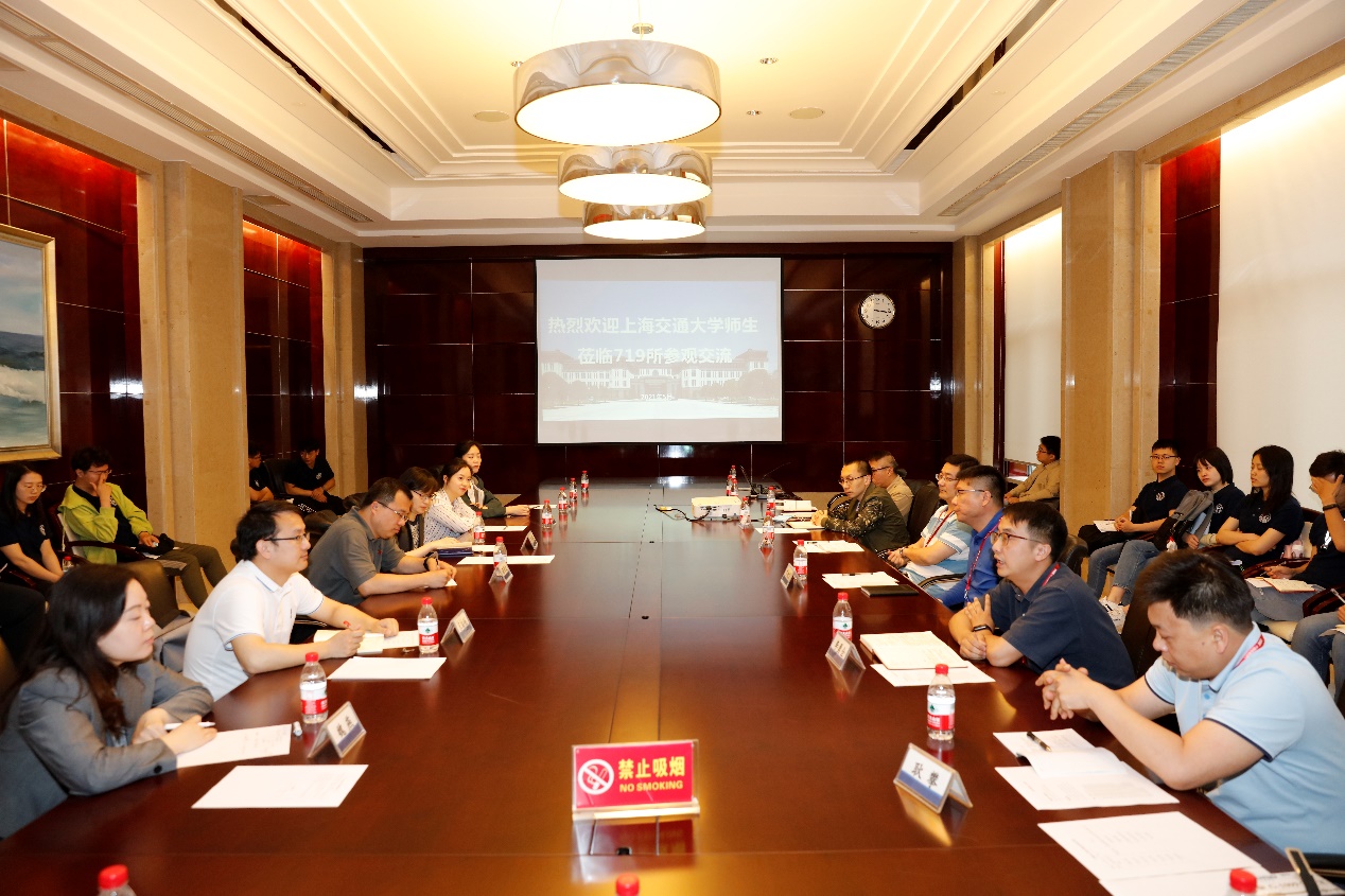 实践团在七一九所陈列室详细了解了七一九所的发展沿革,对七一九取得的辉煌成就连连赞叹,也对七一九所产生了更加强烈的向往之情。参观完毕后,七一九所人力资源部主任艾昶宏与部分在所工作校友、相关科室负责人与实践团举行了座谈。艾主任向大家介绍了在所工作的基本情况,各科室负责人介绍了不同科室负责的研究方向和工作内容,三位新入职的校友吴思源、李宇坤和吴陈虔也向大家分享了自己的工作经历和感想。实践团的同学逐一发言,并就自己感兴趣的内容与七一九所进行探讨与交流。艾主任与各科室负责人表示,非常欢迎大家加入七一九所的人才队伍,共同为核潜艇事业的发展而作出贡献。